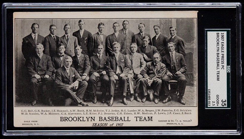 This is a real photograph postcard of the 1907 Brooklyn Superbas Baseball Team. They finished 65-83, behind the Chicago Cubs, Pittsburgh Pirates, Philadelphia Phillies, and New York Giants in the National League standings. This postcard was distributed by Eagle Press of Brooklyn, NY.