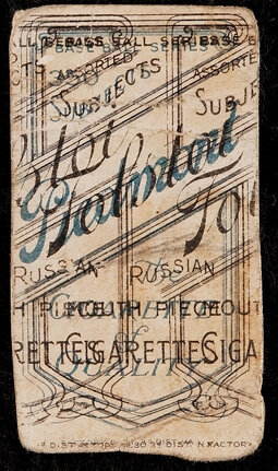 This T206 baseball card is what is known as a printer's scrap. The back of the card was used to test the printing press before printing new batches of cards. Consequently, this card has 4 backs in 1: 1 Piedmont back and 3 Tolstoi backs. It is a fun card to look at!