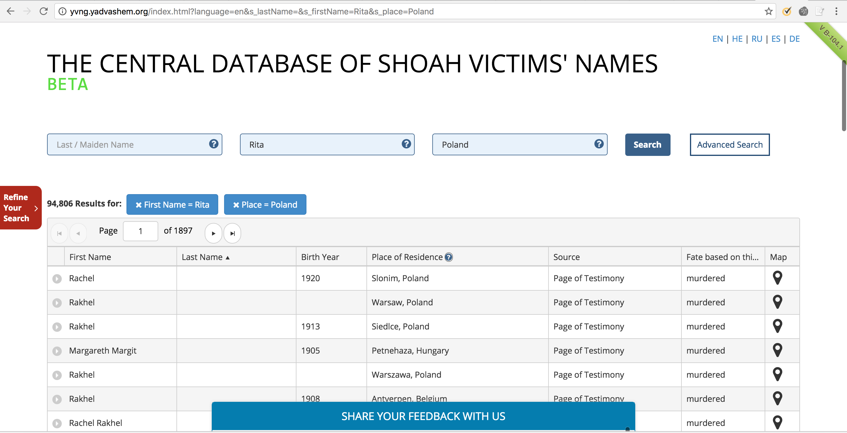 This is a screenshot of a test search using Yad Vashem's Central Database of Shoah Victims' Names.
